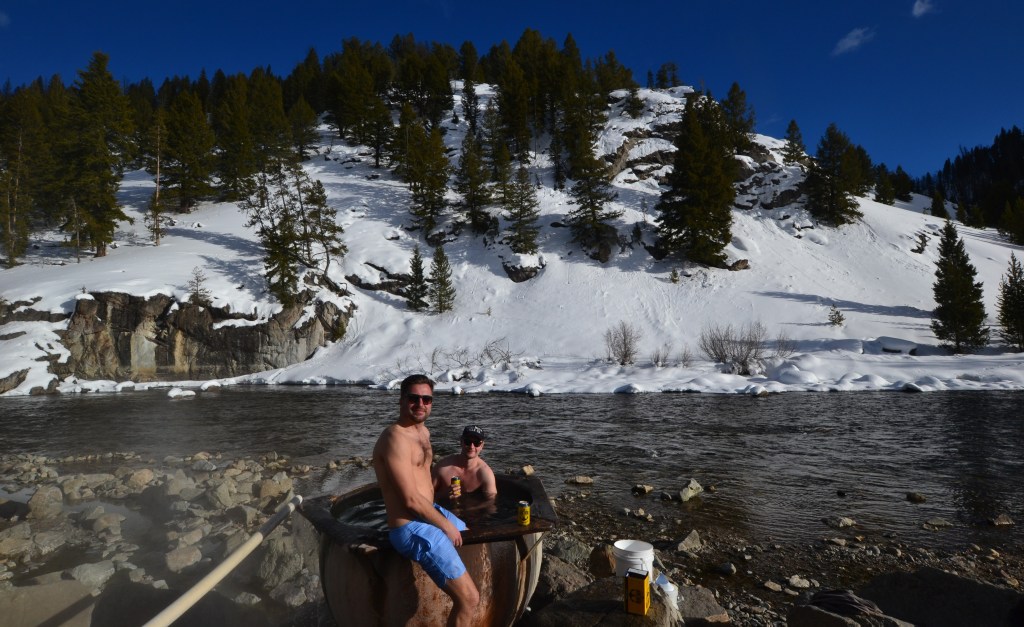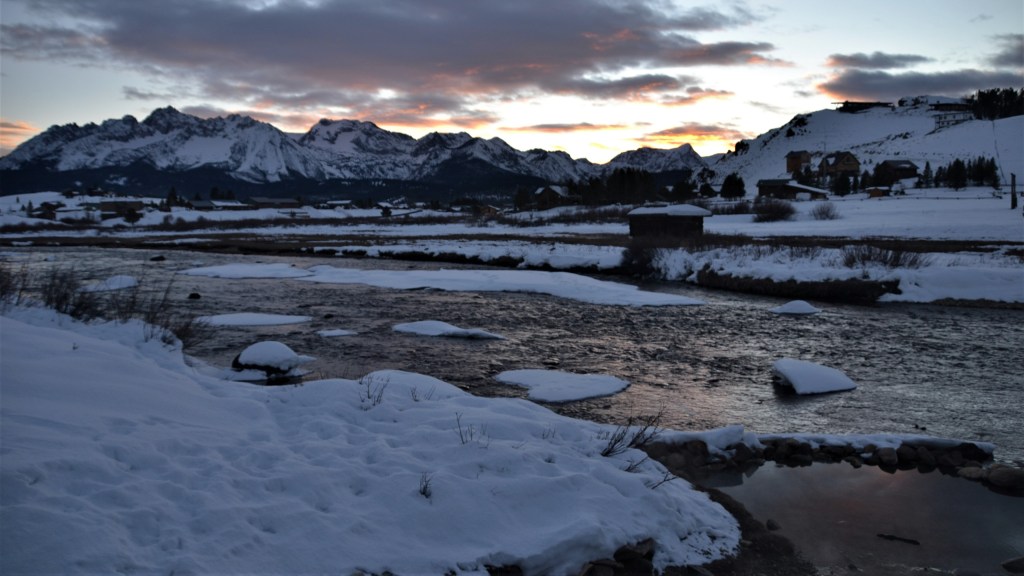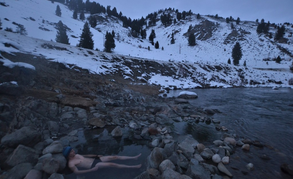 We chose as destination what seemed most obvious on a map – Stanley, a remote mountain town some 200 miles north of Twin Falls and conveniently close to the Sawtooth mountain range, the latter being home to no less than three of the 50 Classic Ski Descents of North America. A stop at the local park rangers’ office was reassuring. Not only was there plenty of backcountry skiing in the area, especially for those who brought with them a snowmobile to traverse the flats between the highway and the base of the mountains, but also a number of easily accessible hot springs. We had no snowmobile but optimistically procured a map and were given directions to the various hot springs. The weather forecast was promising what would become the first snowfall in weeks. We checked into the local motel and went for an evening soak at Cove hot springs.