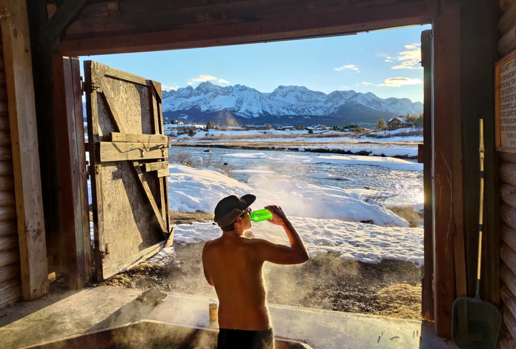 Back at the car, we refocused on what the conditions were right for: hotspringing. Martin wondered where to get the bindings fixed and whether that mechanical problem might jeopardize the main non-hotspringing activity before it had even started. We found the coordinates of Boat Box hot springs on some obscure webpage and spotted them little later just off the highway. It was a retired piece of mining and smelting equipment that had been turned into a bathtub for two – magnificent. Back at the motel, we felt compelled to also pay a visit to the property’s very own hot springs – another magnificent pool covered by a wooden cabin with an opening facing the Sawthooths. The sunset was spectacular. A long hike and two different hot springs in the same day. If that wasn’t something to be proud of.