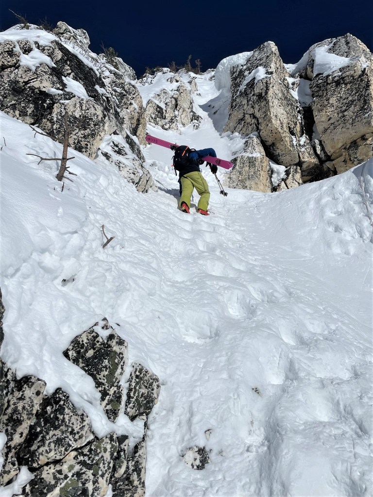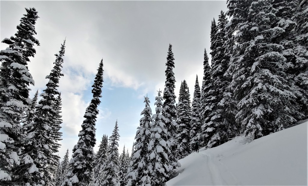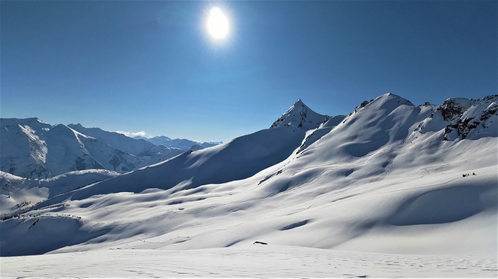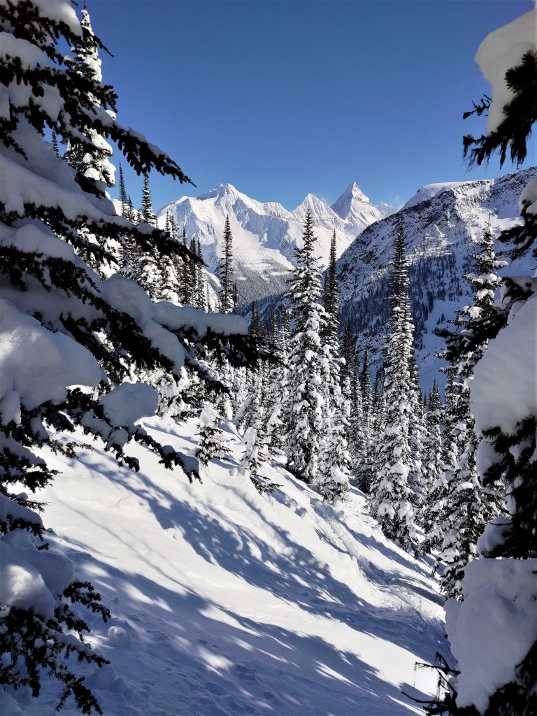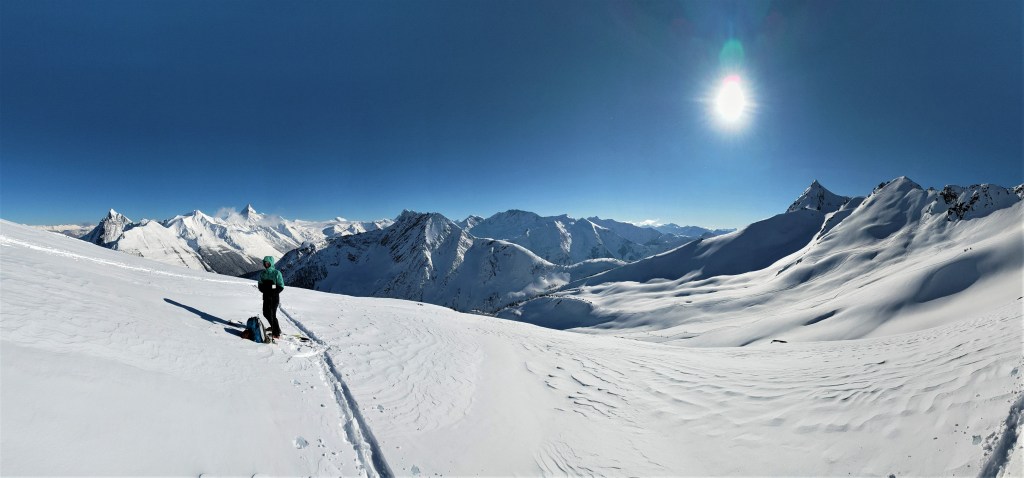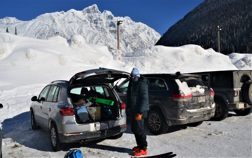 It was a stunning day first day at Rogers Pass, with blue skies and fresh snow covering the peaks that surrounded us, which towered beyond 3000m in altitude. As we got out off the car and the thermometer had not yet climbed above -25°C, however, not only were toes frozen but it also seemed very difficult to think clearly. We looked for warmth at at the visitor’s center. It was closed due to Covid-19. We thus signed away through a shop window all of our rights vis-à-vis Her Majesty the Queen of England, in right of Canada and all her national parks. We did not read any of the fine print but did obtain a day permit for skiing. Martin wandered around the parking lot aimlessly looking for somewhere warm and had already accepted the thought that the day of skiing had ended before it started. We ultimately found refuge in the newly built restrooms at the far end of the parking lot. This suddenly seemed a perfect place to spend the day and we were in no mood to go outside. Some 30 minutes of heated floors and tea from our thermos bottles later, things became a little clearer. We got our gear from the car, changed inside the restrooms and set off for Ursus valley.
