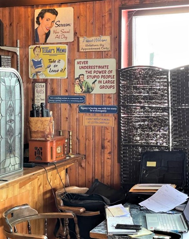 Aside from the excellent skiing, Golden also turned out to be an exceptionally friendly place. As the Family Day holiday passed and accommodation started being just a little less than fully booked, we moved house closer to town and settled at a place called Alpenrose. Richard, the owner, made sure the hot tub was heated to the perfect temperature every evening. During the daily après-ski soaks, we met families from Calgary and the northern edge of Saskatchewan, all keen on sharing their life stories and good advice about skiing, tires and fixing car heating systems. It was agreed that Craig, and other hotspringing acquaintances, would never find out that we now bathed regularly in artificially heated and chlorinated water. Golden, more generally, did not seem to lack life stories and words of wisdom. We met John at the laundromat, a self-proclaimed professional ski bum originally from Québec, who had recently returned from 25 years in Japan and was living in his Japanese-made van. He proudly declared that he does not use heating in tropical -20°C. Within 30 minutes, we knew everything we wanted and did not want to know about Japanese culture. Another Québécois ski bum in his 60s, who rode the gondola with us, proudly presented his season stats recorded on his phone – a whopping 612,000m vertical skied in the 2018/19 season, a record he was on track to beat this year. (The Covid-19 year of 2020/21 was, of course, an outlier.) Last but not least, there was Bend Café. The concentration of wise words posted on its walls made it hard to concentrate on having breakfast.