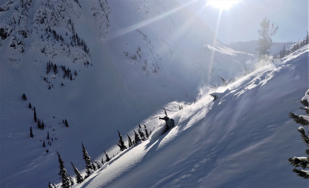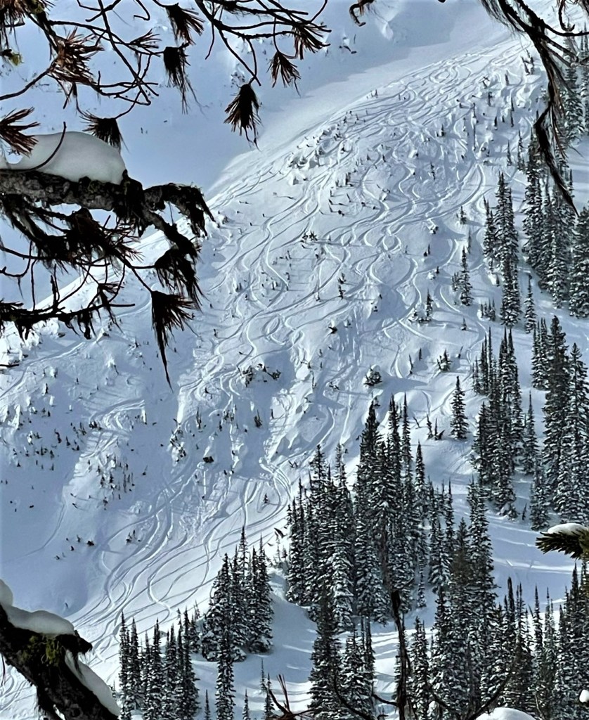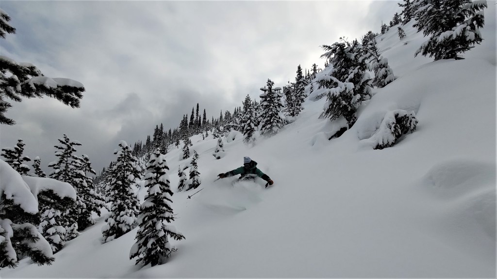 None of this mattered all that much, except perhaps the dire tire situation. The skiing got good. We found a small rental apartment south of Golden and, by the next morning, temperatures had dropped to well below 0°C and rain had turned to snow. We had a great few days at Kicking Horse, hitting the Terminator runs, Stairway to Heaven and the subsequent descents back to earth, Super Bowls, and various places with excellent snow just beyond the ski area boundary. The forest off the road to Kicking Horse was not that thick after all, and we succeeded with a seemingly endless approach to ski untouched glades. Then, as temperatures dropped to below -20°C, there was Rogers Pass. But more about that later.