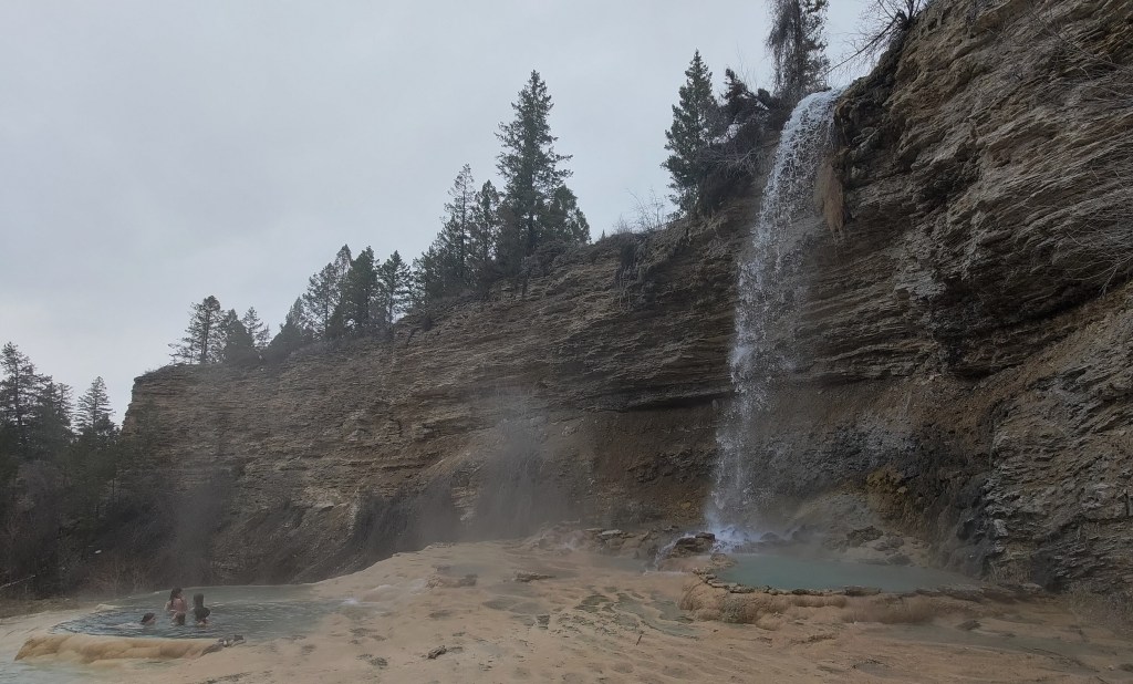 The vastness of British Columbia did not make it any easier to choose where to go. As we drove north on Highway 93 through the rain, we decided that we might as well keep going until it got colder. We did take a break at Fairmont Hot Springs. After all, this trip was as much about hotspringing as about anything else. Beautiful though as these springs were – they came in the form of a waterfall – the soak remained brief as the temperature was more in the range of lukewarm than hot.