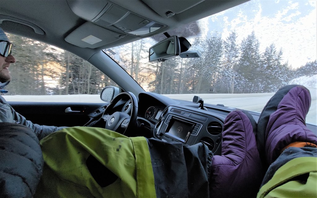 But our first foray up the pass came with another, even less convenient truth about our car: it had functioning ventilation but no heating. This may seem like a minor detail, and indeed we had barely noticed it during the leisurely 2000km drive from San Francisco. But it is a problem whose magnitude is inversely, and clearly non-linearly, related to outside temperatures. To us weak Europeans, Arctic cold can be handled for as long as 1) it is dry; 2) there is no wind, and 3) one keeps the body active, for example through hiking or skinning up a mountain. The air in our car was indeed dry. But as the exterior thermometer read -27°C and cold air was blown at us while we sat and drove up the pass, toes and other extremities were numb within a matter of minutes despite our wearing of all warm layers we had packed. At snowy-road-with-Californian-tires speed, the 80km drive took us more than 1.5 hours.