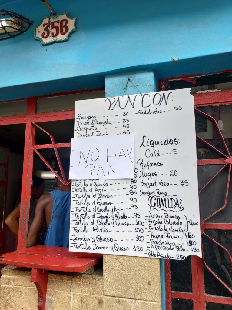 For most Cubans, basic foodstuffs are rationed an available at heavily subsidised prices from local bodegas. The wait to be served can be endless. For those who can afford, not many given the median wage indicated above, food can also be bought from corner shops, super markets that only accept card payments in Euros and US Dollars and restaurants. A few examples of luxury shortages: “La pura” Michelada with salt and lime at La Vitrola bar in Havana Vieja comes without beer. El Café, a hip coffee shop in Havana Vieja that serves breakfast, has no bread, and neither do most corner shops in Havana that all display a sign on 2 of 3 days saying “No Hay Pan“. A serious shortage affecting most Cubans, who live on a fertile island surrounded by warm seas with ample fish stocks that nevertheless has to import 60% of its food : foreign currency, mainly earned from tourism before the Covid-19 pandemic.