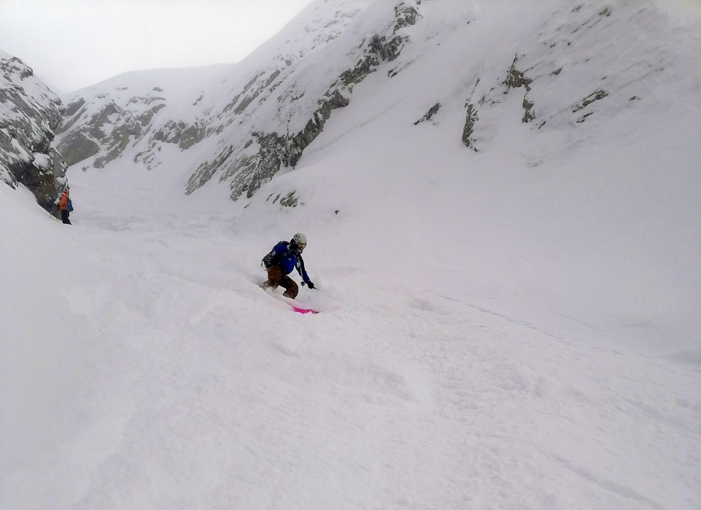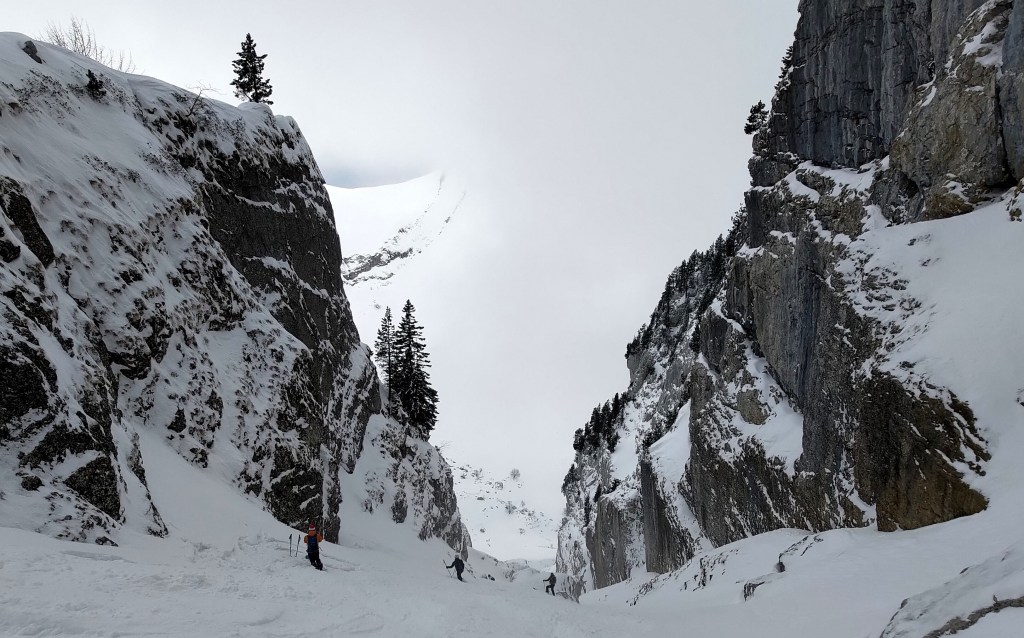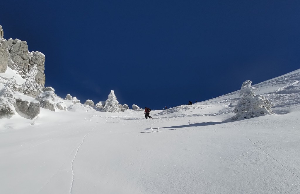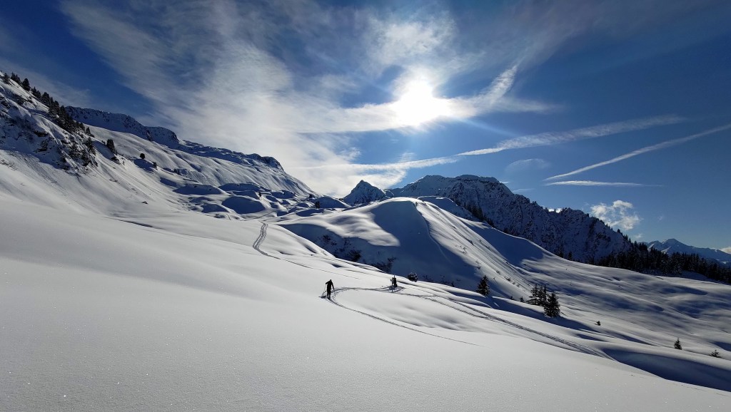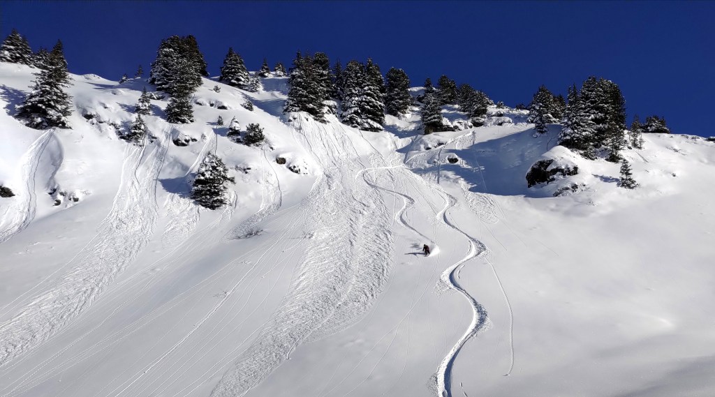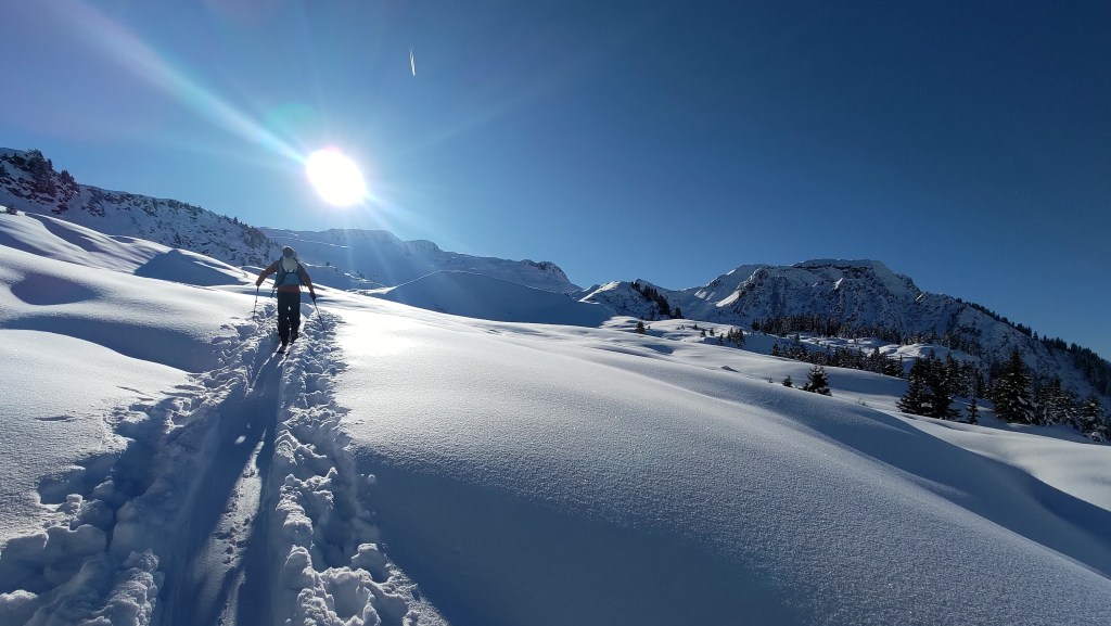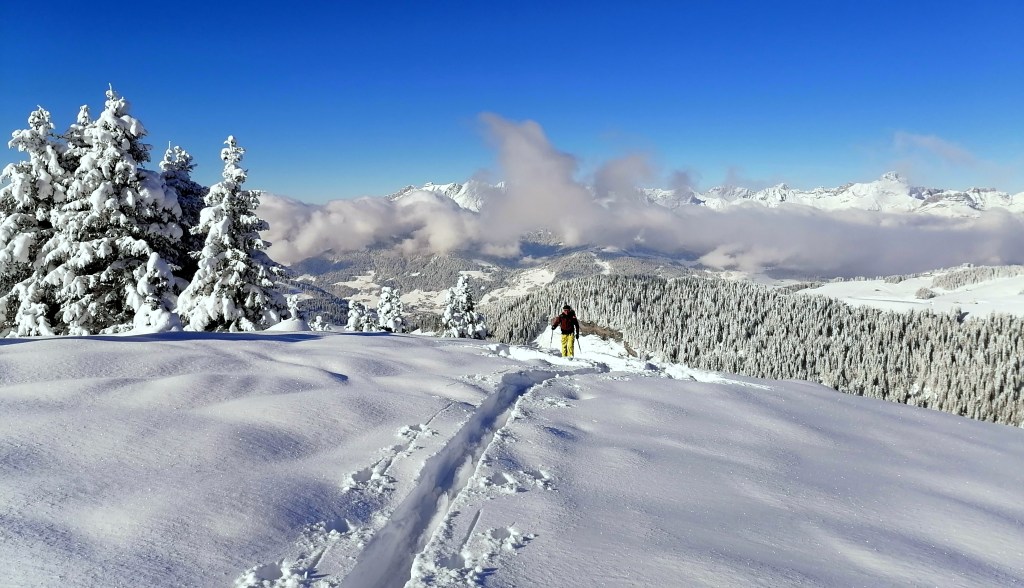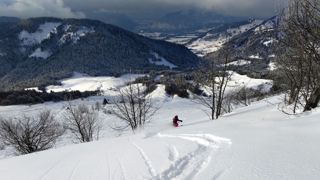 Disons-le franchement, quand il y a de la neige et il fait froid, ce n’est pas la peine d’aller loin pour faire du bon ski. Selon des sources plus ou moins crédibles, il paraît que le charme des Bauges est assez directement lié au caractère relativement éphémère de leurs bonnes conditions d’enneigement. Tenant compte des températures basses et des dernières chutes, on n’hésite donc pas un moment à viser un classique du coin. RDV vendredi matin à Grésy-sur-Aix pour être au parking du Reposoir au-dessus de Bellecombe peu après mais loin d’être les premiers. On aura vite doublé les autres groupes dans la montée à la Dent des Portes. Une traversée de l’arête et une dernière montée par l’épaule bien dégarnie plus tard, on se retrouve, malgré tous nos efforts, à 15 à l’entrée du couloir nord du Trélod. Par peur de l’autorité ou bien grâce à leur test de stabilité de neige avec un soldat-skieur encordé, on donne priorité dans la descente aux chasseurs alpins qui nous ont suivi à la montée mais nous suivons vite leurs traces de descente, ce qui ne plaît que moyennement au groupe annecien arrivé peu après nous. L’ordre de priorité est vite oublié au bout de 500 m de dénivelé en poudre 5* et stable, et tout le monde arrive en bas avec le grand sourire. Petite remontée à la crête et la descente finale de la Dent des Portes est un bonus en plaisir pur. On se rejoint le lendemain avec Robin et Yvan pour un tour dans le Beaufortin où il fait tout aussi beau et tout aussi froid, avec une neige qui reste toute aussi bonne. On vise les Rochers des Enclaves mais la sortie se termine en rotations entre le Lac de la Girotte et la Montagne d’Outray. Journée de repos dimanche avec qu’une petit balade de 600m dans les Bauges parce que c’est beau, ce n’est pas loin est les bonnes conditions ne s’avèrent pas aussi éphémères que ça. Et oui, ça doit sûrement faire du bien aussi pour les ligaments croisés de Joanna.