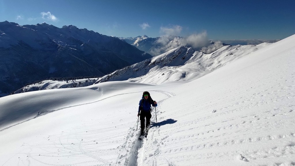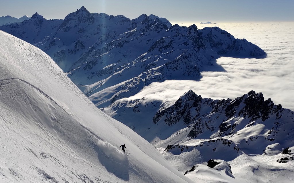 Pas grande chose en neige de prévue pour le reste du mois, un petit retour d’est qui s’accroche à la frontière italienne m’amène à Montgenèvre vendredi 27 après un petit détour par la Grave. Je rejoins Dianath avec un groupe d’amis parisiens et lyonnais pour la journée en station. Pour samedi et dimanche, on ne dit sûrement pas non à l’invitation très aimable de Joanie et Clément au Rivier d’Allemont. Le fait qu’il ait neigé un peu moins dans le coin ne nous empêche pas de faire deux belles sorties au-dessus de la mer des nuages qui entoure le sud des Belledonne. La qualité de la raclette du soir est bien superieure à celle de la neige, qui reste froide mais est entre-temps aussi bien cartonnée par le vent.