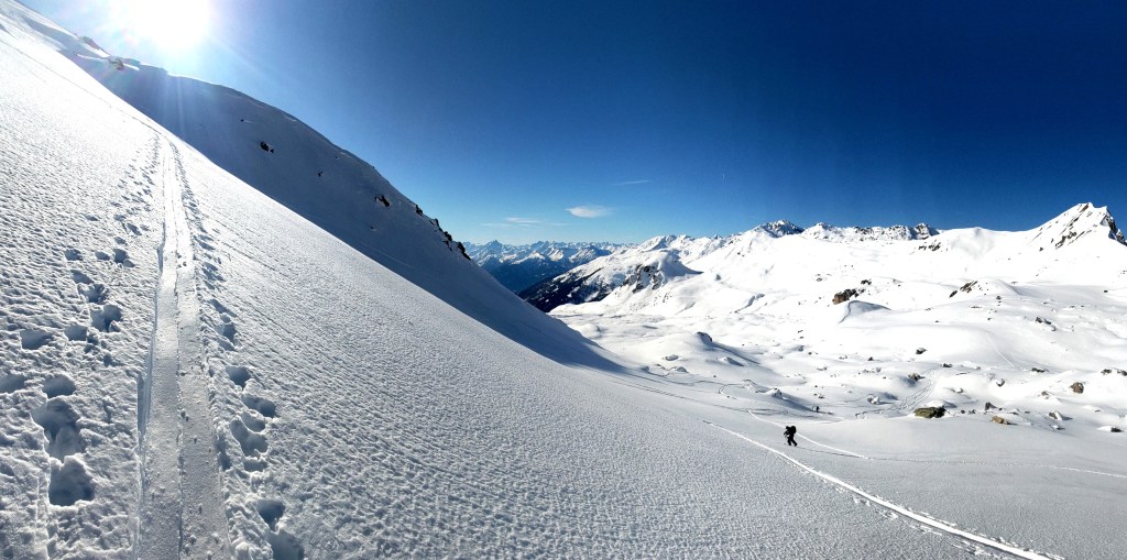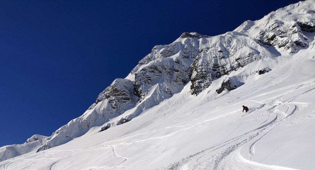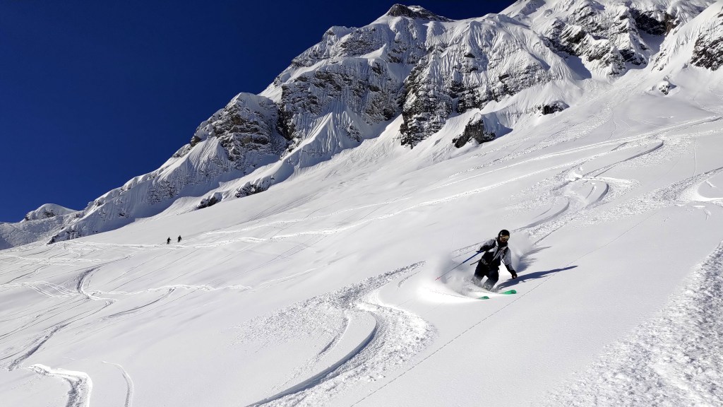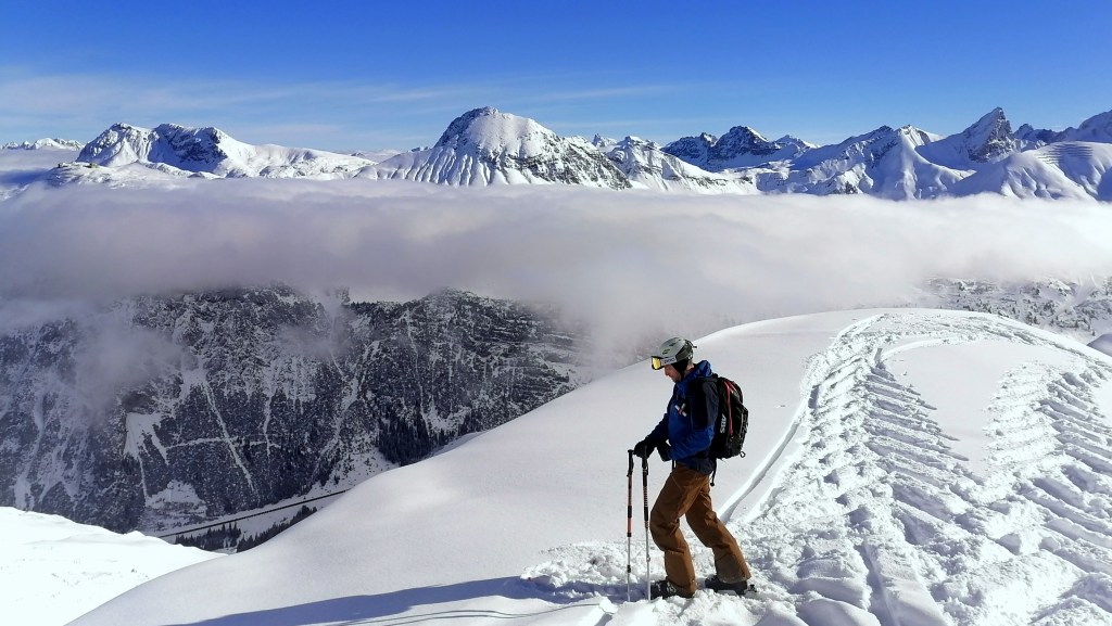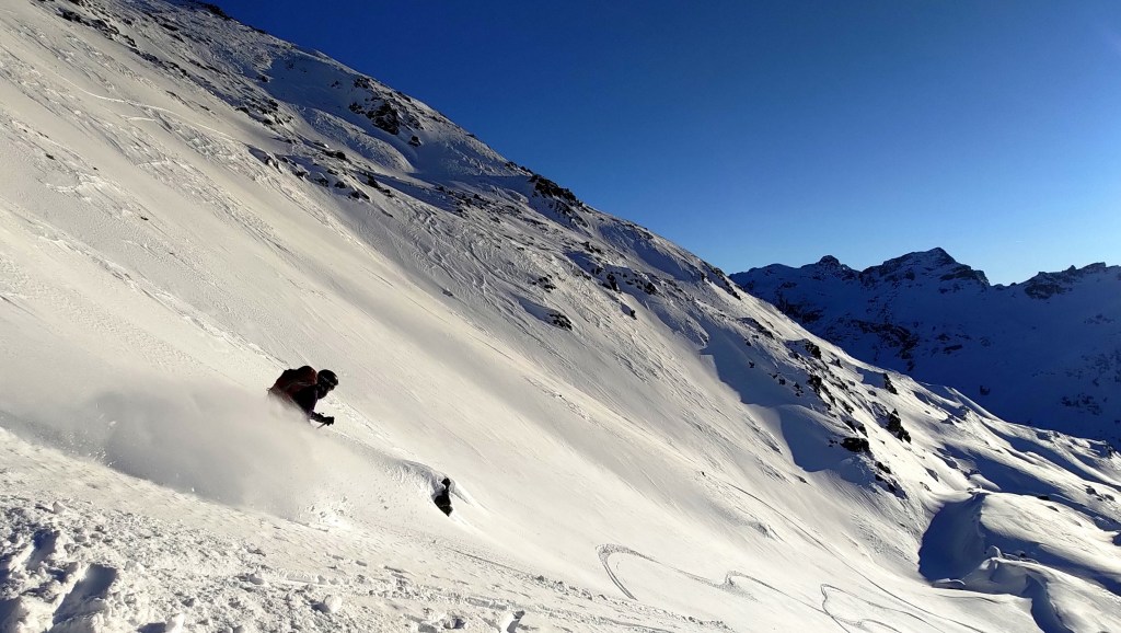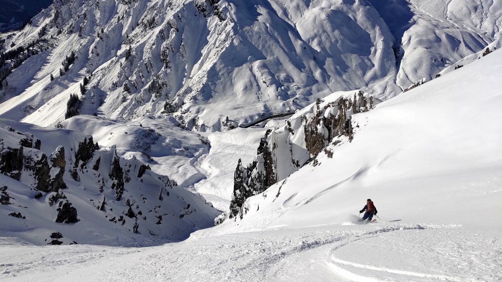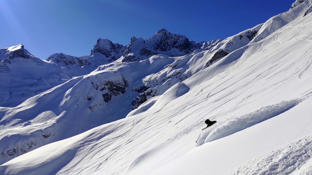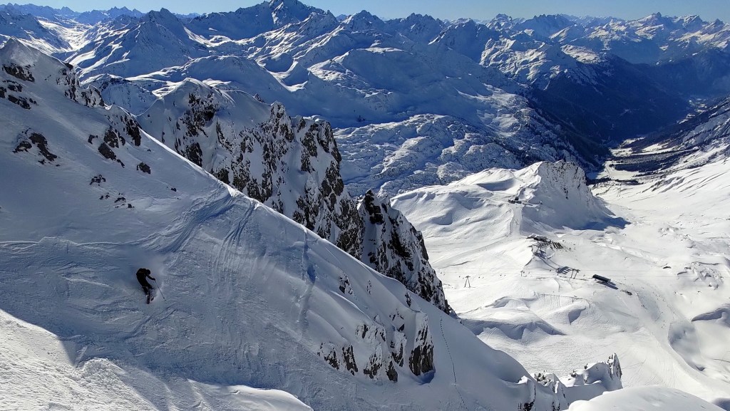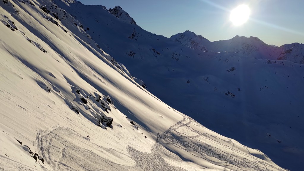 Fears of phoney forecasts proved true on Sunday morning. A frontal attack with ample mechanical assistance on Rendl was nonetheless launched from St Anton amid fog banks and occasional rays of sun. While a complete whiteout at the top of the ridge precluded an incursion into Hinterrendl from the steeper slopes behind Riffl 2 chairlift, excellent and untracked snow was hit on the western slopes in luckily timed windows in the cloud cover. Stuben was hit late afternoon, where unlikely patches of decent snow were found in a last descent from Albona to the extraction point in the Verwall valley. Perhaps not an unconditional success, the day did turn out more successful than expected.