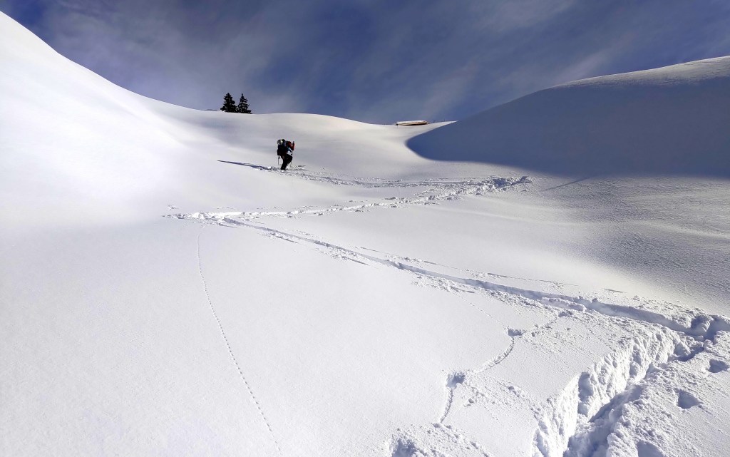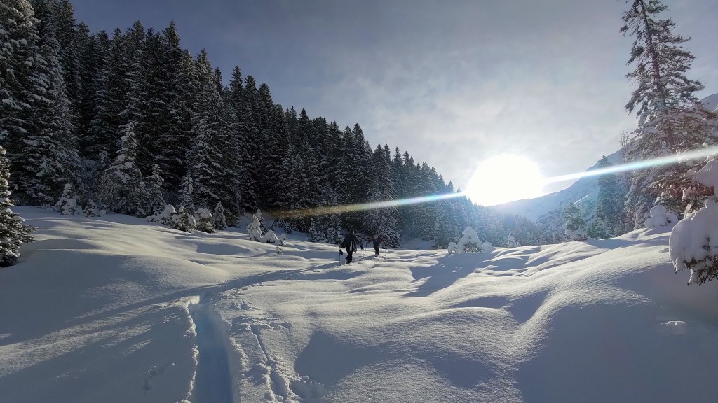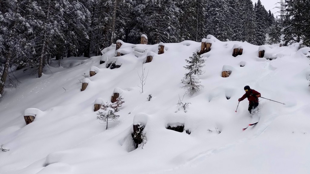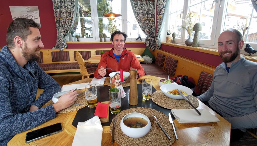 The fact that the little snow that had fallen was accompanied by gale force winds and that avalanche risk hit level 4 on the scale of 5 made it no easier to decide where a first incursion should be targeted. After long deliberation, a decision was made early on Friday morning to move back west to where snow had been sighted the night before and charge the north faces south of Langen station, towards Krachelspitze or, in case the snowpack would prove too unstable, a safer retreat on slopes not exceeding 30° below Kaltenberger Hütte. The snow proved excellent, albeit lacking a sloid base layer. Truth be told, quantities were nowhere near what intelligence had suggested. A first descent from Kaltenberger Hütte was accompanied by rapidly deteriorating visibility. Although welcomed as a sign foreboding the incoming snowfall, it forced the squad to hide in the forests for the following two rounds. Given the tricky circumstances, a first and small but decisive victory was soon celebrated in Stuben with cold beers and hot Kaspressknödelsuppe and Spätzle. By 4pm, clouds were thick but still no snowflakes in sight, giving rise to suspicion that intelligence reports of abundant snowfall might turn out to be fabrications.