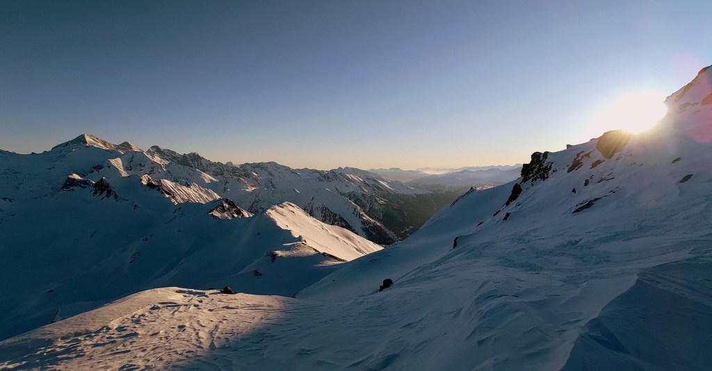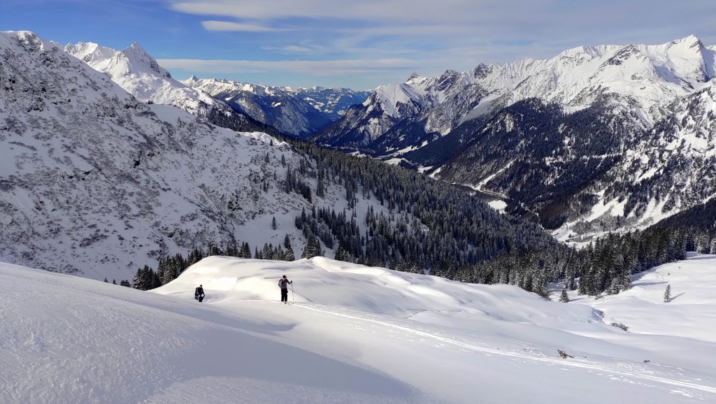 Whether one Swede can replace three Frenchmen is a questions that is tough to answer. Be that as it may, the rendez vous with Andreas happened as planned at St Anton station on Tuesday morning while Josef held guard duty in Fliess. Another surprisingly good day of skiing followed between Hinterrendl, Schindlergrat, the remaining Ochsenboden couloirs and Stuben. A short skin up the Maroiköpfe from Albona rewarded the reduced party of two with a breathtaking last descent in the sunset, past Kaltenberghütte, where the first victory had been won on Friday, to Langen station and an extraction by train.