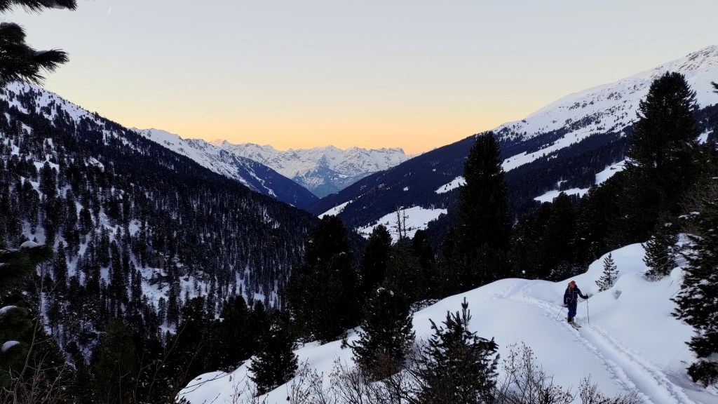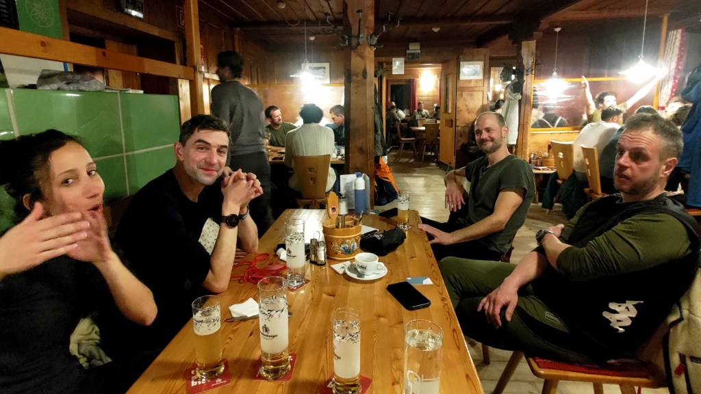 A short reconnaissance tour and skirmishes on Wednesday afternoon were nothing to write home about, although the last descent offered some good snow on a northern aspect below Torspitze and stunning evening light while skiing into the Wattener valley and on the way back up to the hut. While shooting could be heard all around and enemy soldiers in white camouflage gear were digging snow caves and bivouac shelters in -20°C, the team hid away in the warmth and hospitality of Lizumer Hütte, where inflation had not yet hit beer prices and meals, let alone the home-baked poppy seed cakes, were delicious. These facts had not gone unnoticed by a number of other invading outfits from Germany, Italy and the Netherlands.